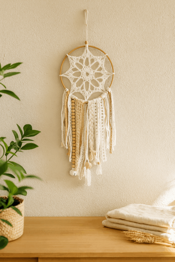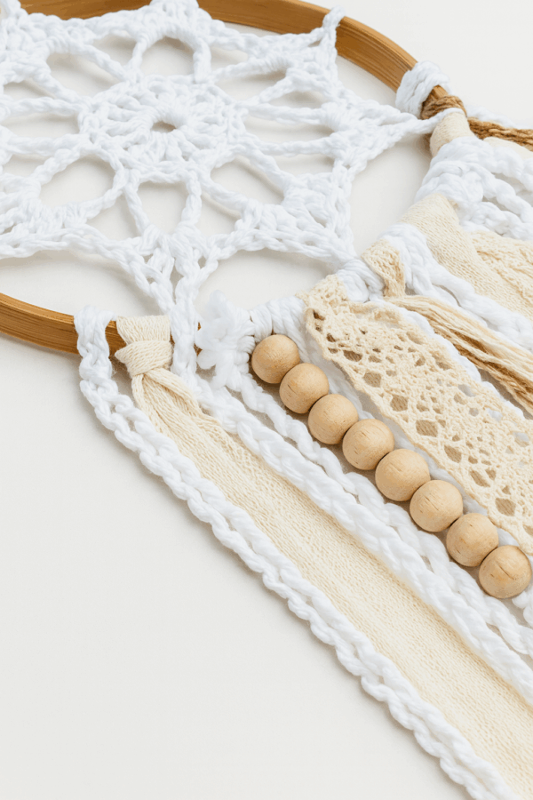 La Mandala Átomo Blanco-Beige es una pieza artesanal que destaca por su sencillez y equilibrio. Tejida a mano en hilo de algodón blanco, se complementa con cintas, encajes, trenzas y cuentas de madera en tonos naturales que aportan calidez y armonía.