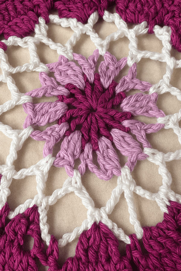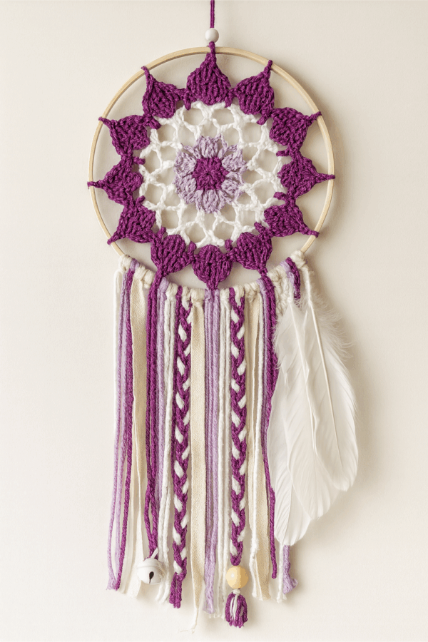 La Mandala Flor Tricolor es una pieza artesanal tejida a mano con hilo de algodón en tonos violeta, lila y blanco. Su diseño floral central destaca por el contraste de colores y la textura del crochet, enmarcado en un aro de madera natural que aporta calidez y equilibrio visual.